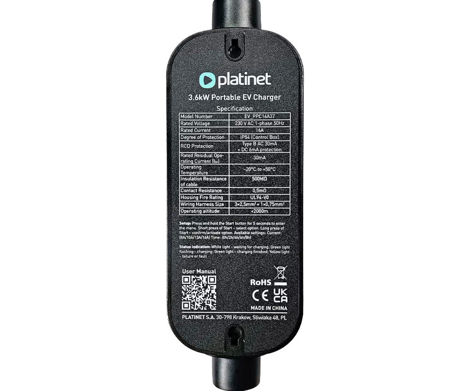 Ste naveličani skrbi, kako najti polnilno postajo za vaše električno (EV) ali hibridno vozilo (PHEV)? Poslovite se od skrbi in uživajte v svobodi polnjenja kjer koli in kadar koli - tukaj je EV električni polnilec Platinet PPC16A37. Ta vrhunska naprava z 3.7kW močjo polnjenja, TYPE 2 kablom z dolžino 5m, ter vgrajenim SCHUKO vtičem, je zasnovana tako, da vam nudi neprimerljivo udobje in brezskrbnost, ter vam omogoča popoln nadzor nad polnjenjem vašega električnega ali hibridnega vozila!