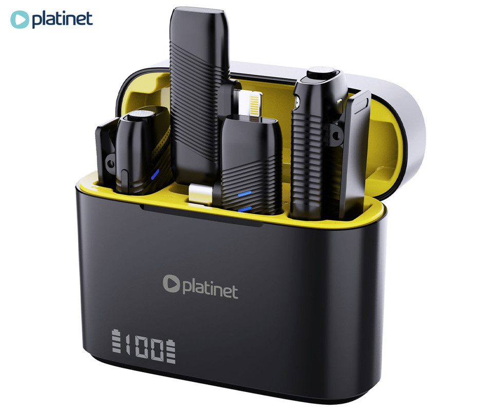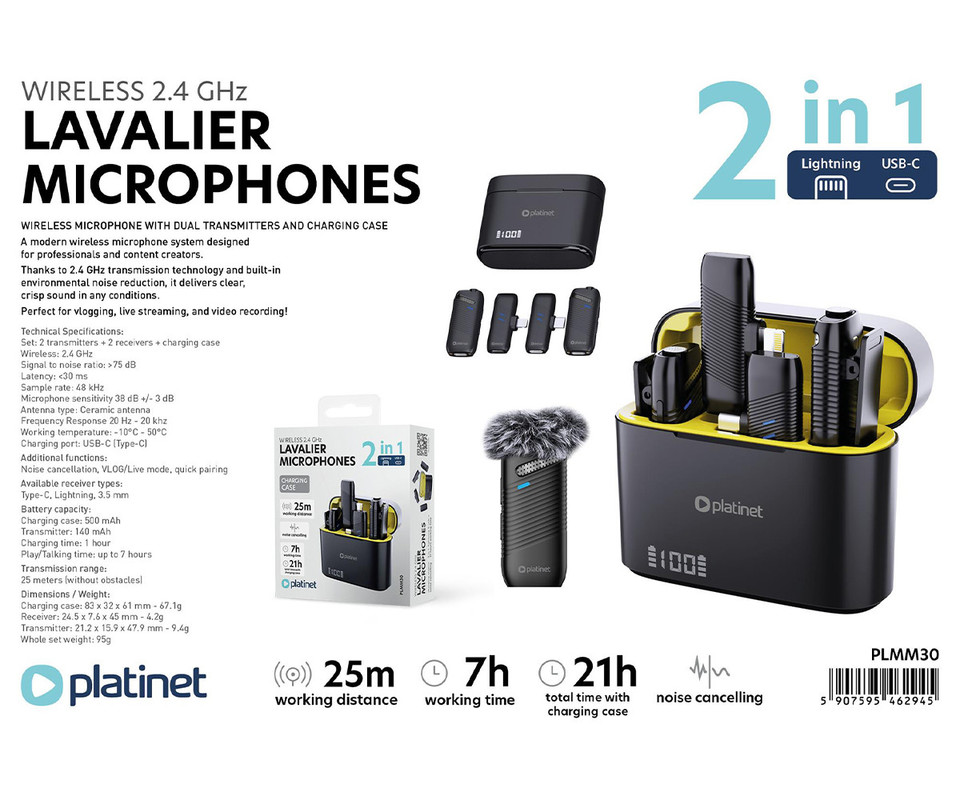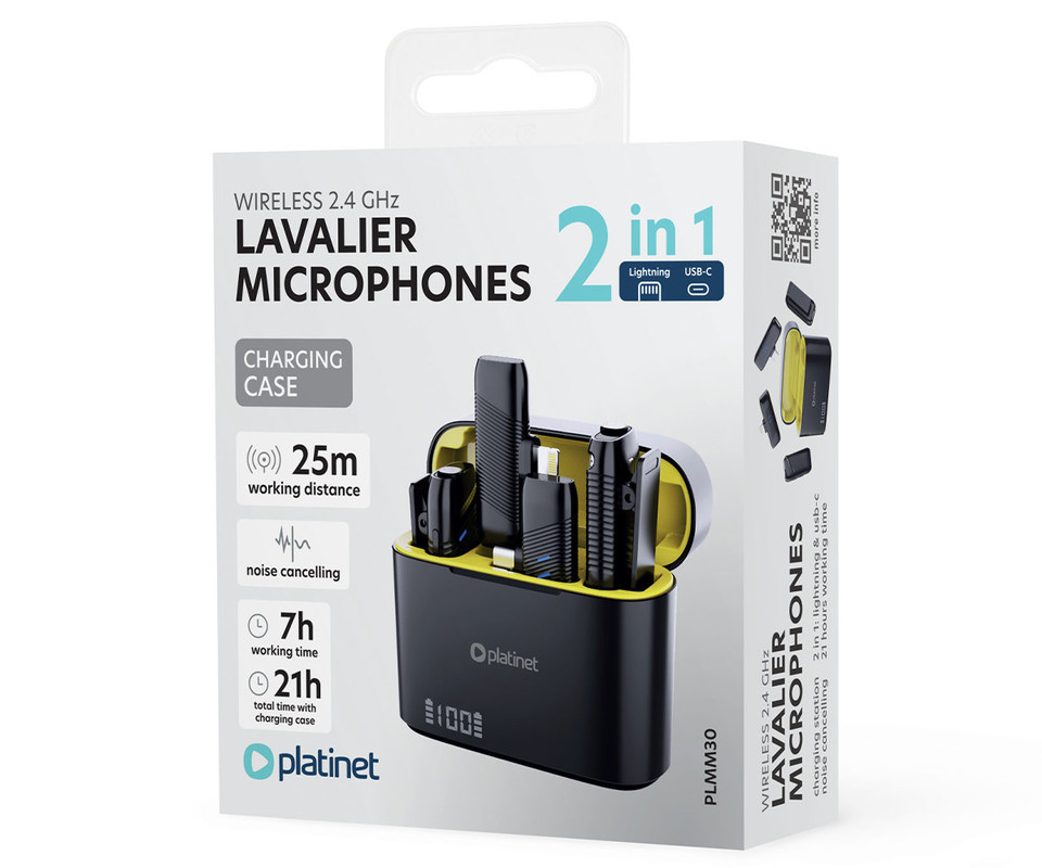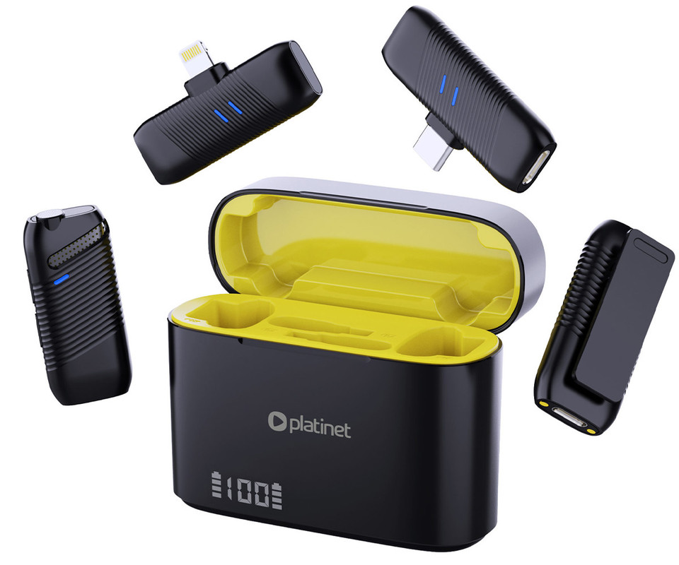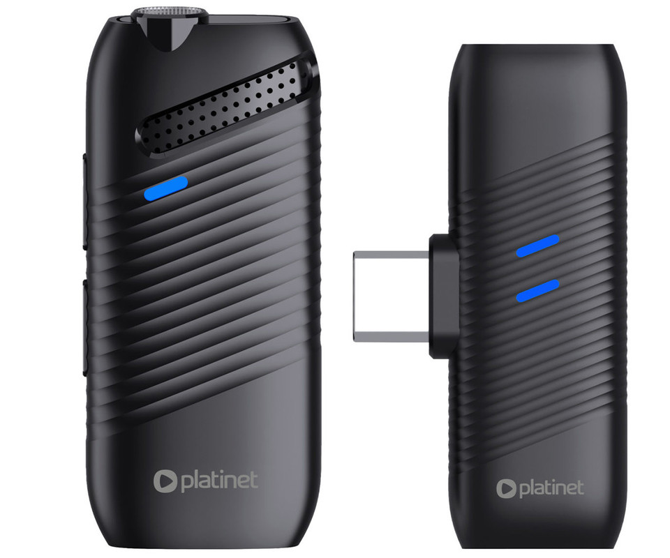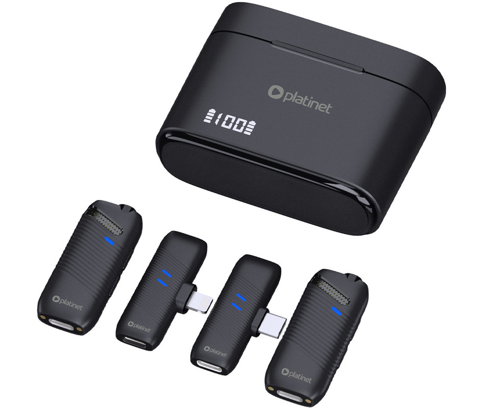 PLATINET PLMM30 2x brezžični mikrofon, mini, lavalier, polnilna baterija, 2.4GHz sprejemnik, doseg do 25m, Plug & Play, CLIP-ON montaža, +polnilna postaja, USB Type-C / Lightning, črn