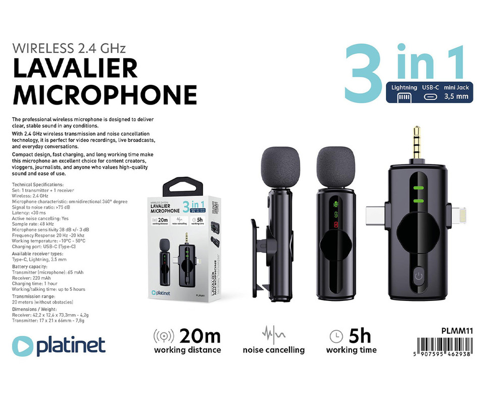 - Tip izdelka: 3v1 brezžični mikrofon PLATINET PLMM11