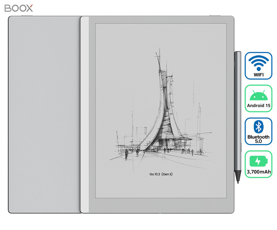 Z BOOX Go 10.3 Gen II imate vedno pri roki inteligenten in zmogljiv tablični računalnik in e-bralnik. Operacijski sistem Android 15, vgrajenega 4GB RAM + 64GB ROM prostora za shranjevanje ter zmogljiva aplikacija NeoReader vam omogočajo namestitev različnih aplikacij, shranjevanje številnih datotek in branje dokumentov v različnih formatih. Tukaj je tudi popolna in velika polnilna baterija s kapaciteto 3700 mAh, ki vam bo zagotavljala delovanje brez polnjenja za več časa. Vse to imate na voljo v eni napravi!