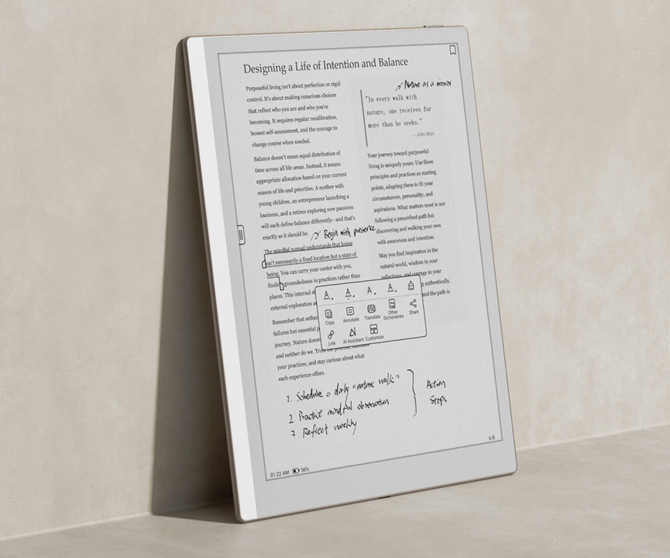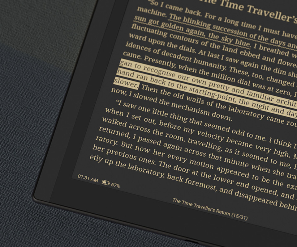 Ta 10.3-palčni e-bralnik ima ultra tanek dizajn z debelino le 4,8 mm ter kompaktno in lahko ohišje, ki tehta le 350 g. Poseben izgled pa dopolnjuje tudi njegova klasična bela barva, ki se popolnoma prilega vsakemu delovnemu okolju.