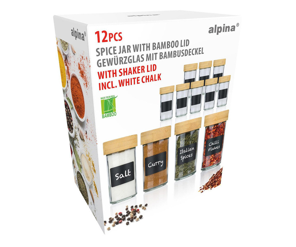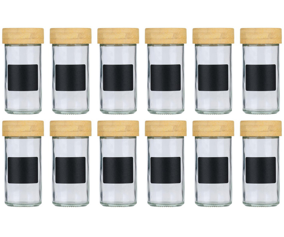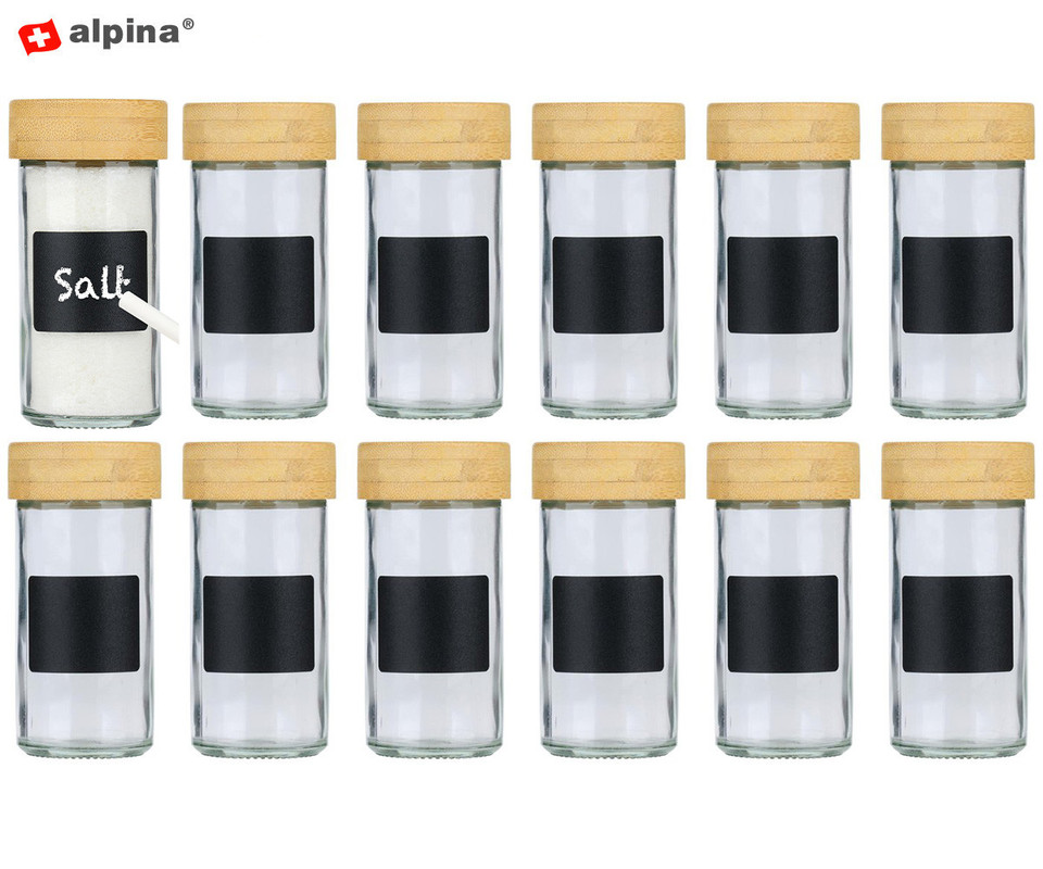 ALPINA komplet kozarcev za začimbe, 12 kos, za vse vrste začimb, steklo, pokrovi iz bambusa, sito vložki za stresanje, etikete za označevanje, kompaktna velikost, +bela kreda