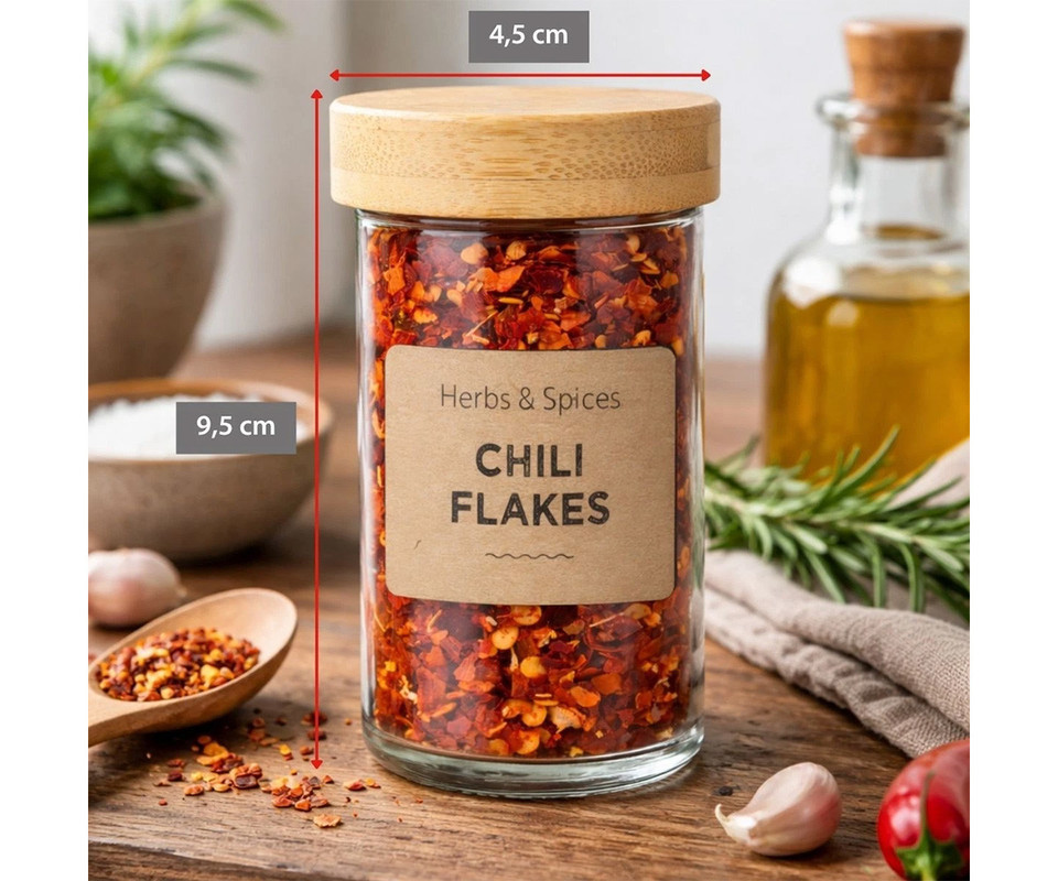 Prozorno steklo omogoča, da vedno vidite vsebino posode, medtem ko tesen pokrov pomaga ohranjati aromo in svežino začimb dlje časa.