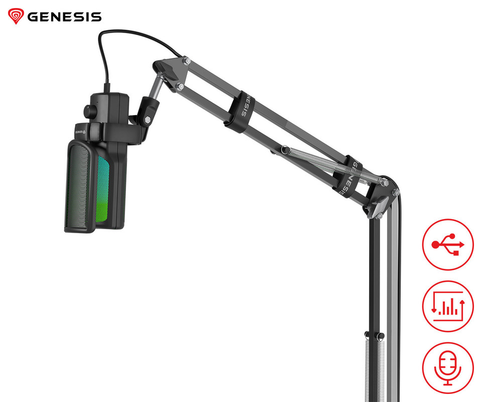GENESIS Radium 251 ni samo mikrofon – je celoten komplet, pripravljen za uporabo. Za razliko od Radiuma 250 boste našli robustno držalo mikrofona, ki vam omogoča, da mikrofon postavite poljubno, ne da bi zavzel dragocen prostor na mizi. To vam daje več prostora za miško, tipkovnico ali drugo dodatno opremo. Dobite tudi pop filter, ki zmanjšuje neprijetne "glasove", kar izboljša jasnost vaših posnetkov. Kabelske vezice pa vam pomagajo ostati organizirani in preprečujejo zapletanje žic.