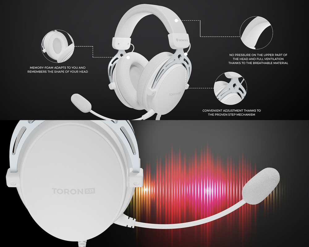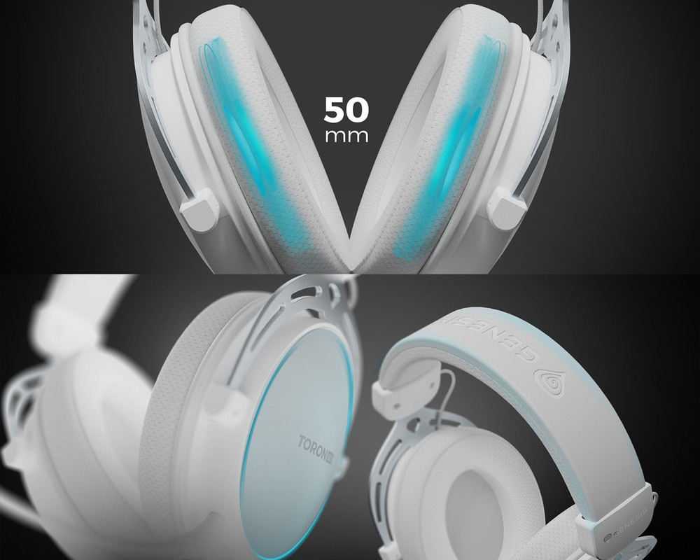 Slušalke Genesis Toron 531 imajo zaprto zasnovo, ki vas bo učinkovito izolirala od zunanjega hrupa. Manj neželenega hrupa = več osredotočenosti na igro, in to še ni vse. Zračen in mehak material na notranji strani naglavnega traku bo zagotovil optimalno temperaturo in zmanjšal tveganje za potenje. Izdelane iz spominske pene , podobne usnju, s tekstilno zgornjo plastjo pa ne bodo zaostajale – ne le da se prilagodijo uporabniku in si zapomnijo obliko glave, temveč združujejo tudi najboljše lastnosti.