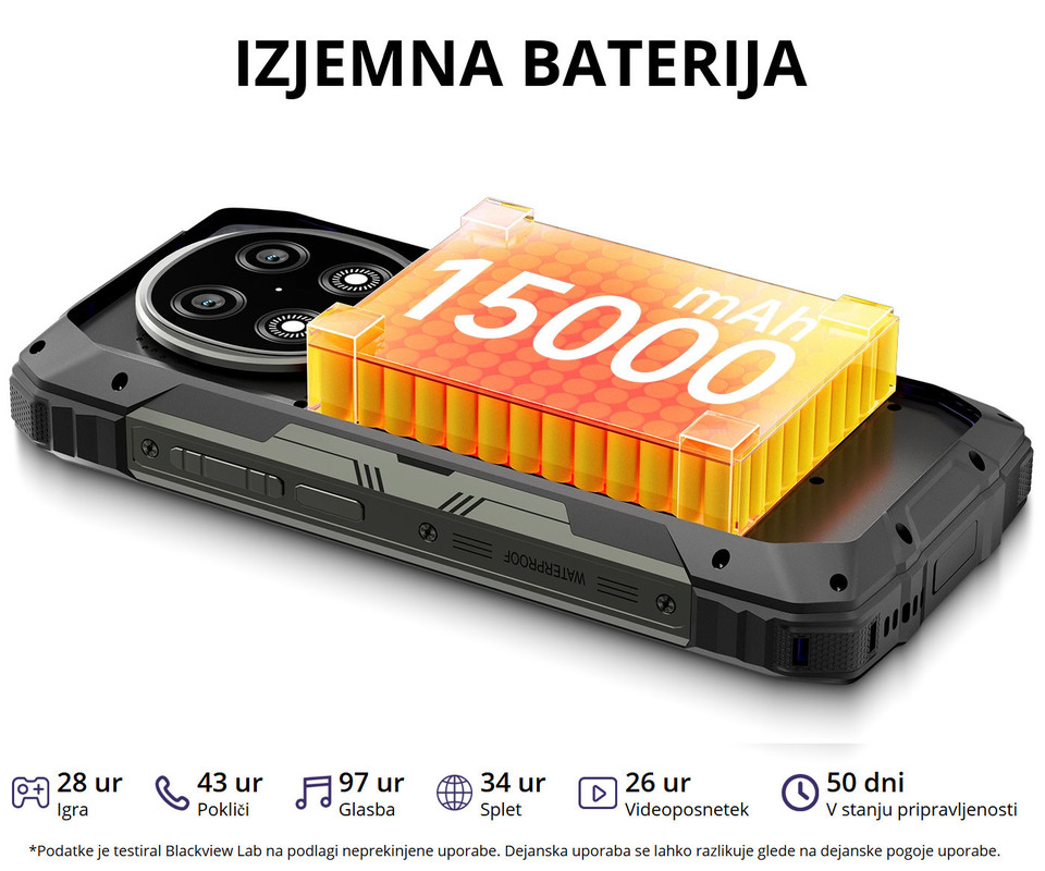 - 15.000 mAh baterija – zelo velika kapaciteta omogoča več dni uporabe brez polnjenja, tudi pri intenzivni uporabi ali delu na terenu
