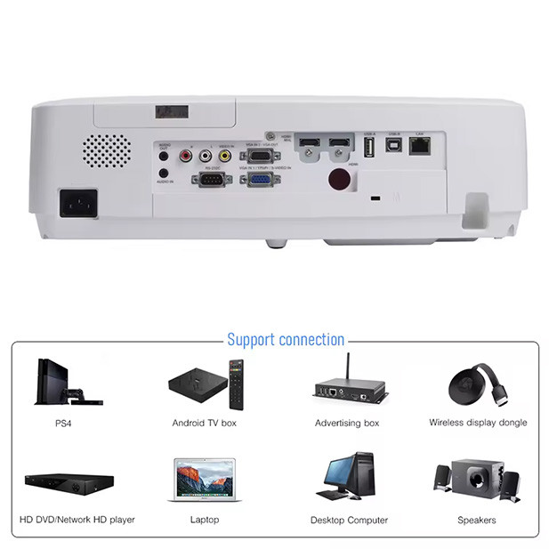 Projektor ponuja bogato izbiro priključkov, kar omogoča enostavno povezovanje z različnimi napravami in večjo fleksibilnost pri uporabi. Opremljen je z 2x VGA, 1x AV, 1x YCbCr, 1x video vhodom, 2x RCA, 1x S-Video S, 2x HDMI, 1x USB-A ter 1x USB-B priključkom. Ta široka izbira vhodov zagotavlja združljivost z računalniki, prenosniki, DVD-predvajalniki, TV-boxi, igralnimi konzolami, kamerami in številnimi drugimi multimedijskimi napravami. Projektor tako brez težav postane osrednje središče vaše domače ali profesionalne multimedijske postavitve.