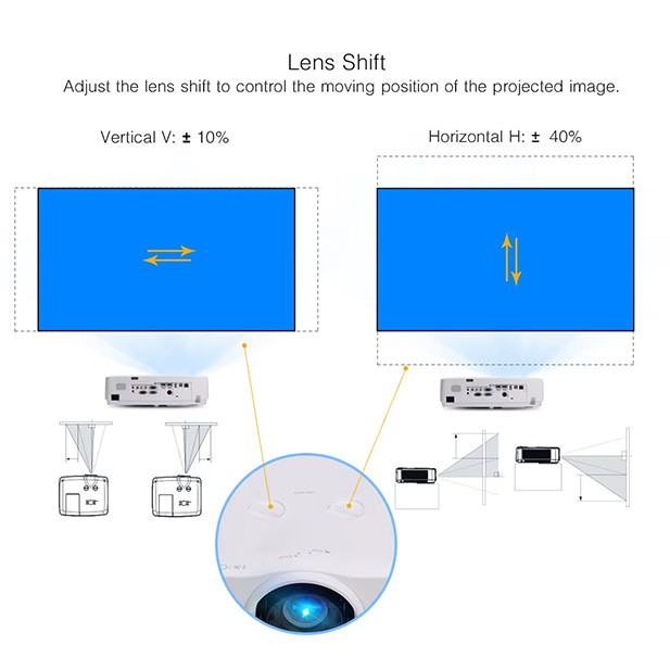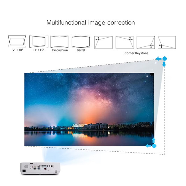 Z Keystone Correction funkcijo je možno poravnati trapezno popačenje slike, ne glede na to, kje je projektor postavljen. Tako vedno dobite pravilno, simetrično in ravno sliko brez dodatnih prilagoditev prostora. Sliko lahko prilagodite z gumbi, ki se nahajajo na projektorju.