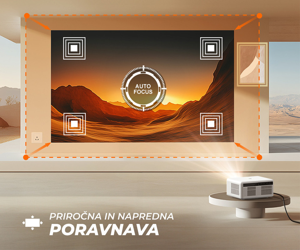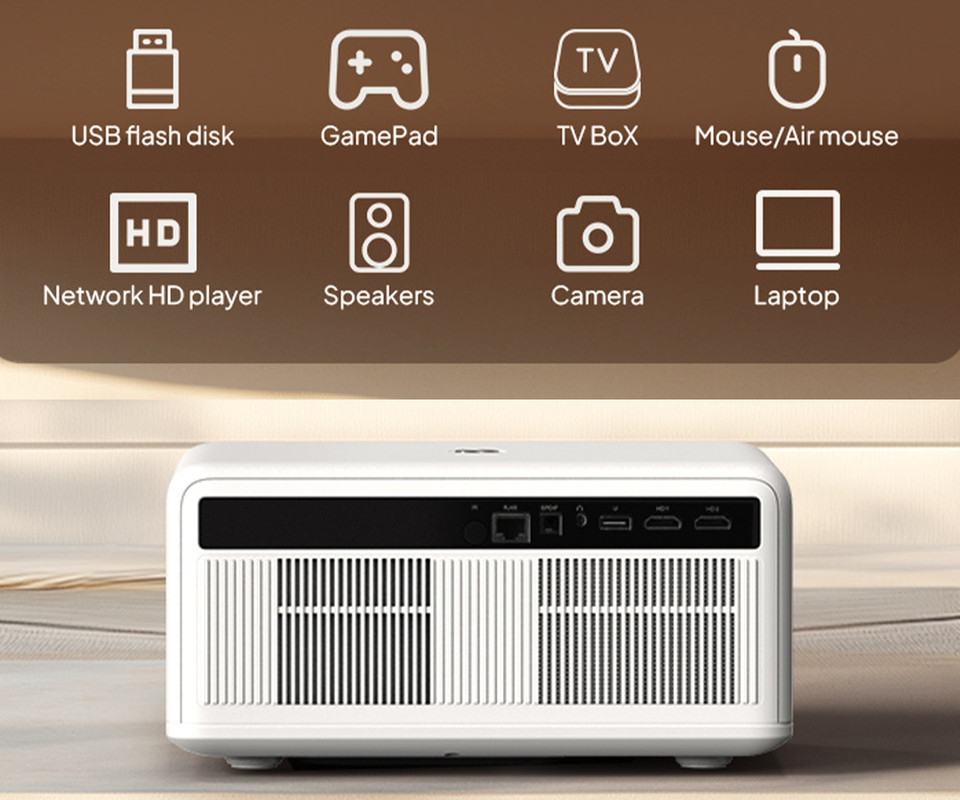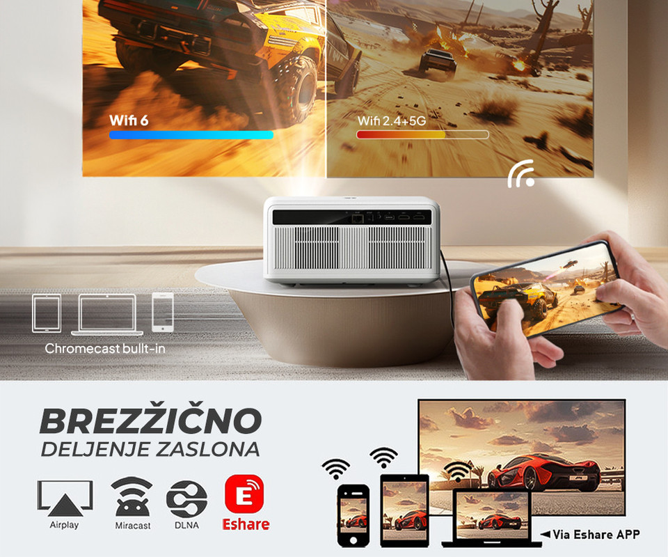 - WiFi & Bluetooth - Zahvaljujoč brezžičnemu WiFi 6 povezovanju in vgrajeni Bluetooth povezavi, lahko uporabljate internet in projektor povezujete z ostalimi zunanjimi pametnimi napravami.