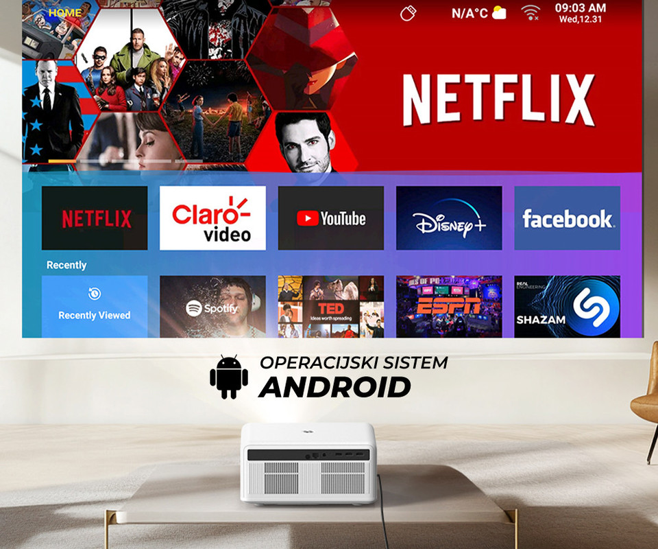 - Android OS - Najnovejši pametni operacijski sistem Android z odlično zmogljivostjo in prijetno uporabniško izkušnjo vam bo pomagal pri enostavni uporabi in nastavljanju funkcij projektorja.