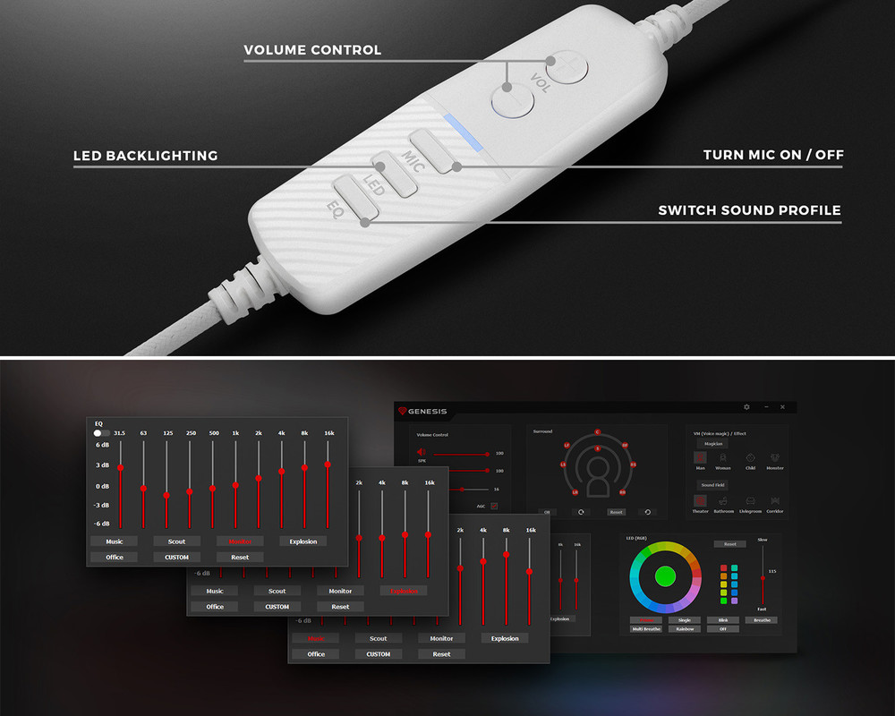 GENESIS Neon 764 vam omogoča popolno prilagoditev zvoka. Izberite med pripravljenimi profili, ustvarjenimi za različne aplikacije.