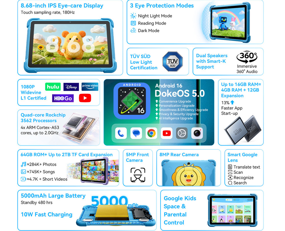 - Lastnosti in funkcije: trpežen ovitek s stojalom, 5000 mAh baterija, dvojni BOX zvočniki, aplikacija Google Kids, Smart Google Lens, WPS prednameščene aplikacije, starševski nadzor, PC Mode način uporabe, Split Screen način uporabe, podpora za Widevine L1, ultra tanek dizajn 12mm, prednja in zadnja kamera, 3 zaslonski načini, …
