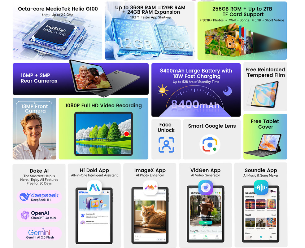 - Lastnosti in funkcije: Doke AI funkcionalnost (ChatGPT + DeepSeek + Google Gemini), razširljiv RAM iz 12GB na 24GB, WIFI, Bluetooth, Quad BOX zvočniki, ogromna 8400 mAh baterija, funkcija razdeljenega zaslona, PC način uporabe, prednameščen WPS paket aplikacij, kovinsko ohišje, ultra tanek dizajn, napredna tehnologija hlajenja, 13MP prednja in 16MP zadnja kamera, ovitek / etui s funkcijo stojala, Widevine L1, Smart Google Lens, odklepanje s prepoznavo obraza, GPS navigacija, 18W hitro polnjenje, pametno predhodno nalaganje aplikacij, aplikacija EasyShare, aplikacija Hi Doki,…