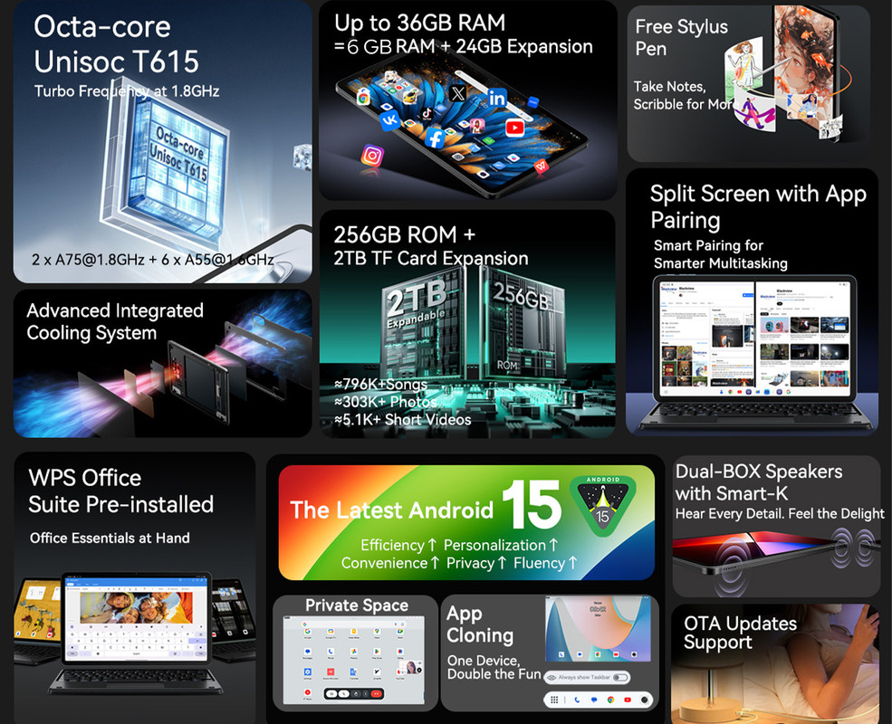 • Lastnosti in funkcije: AI funkcionalnost, RAM 6GB, 4G LTE, Dual SIM, WIFI 5, Bluetooth, Dual BOX zvočniki, ogromna 9000mAh baterija, funkcija razdeljenega zaslona, PC način uporabe, prednameščen WPS paket aplikacij, kovinsko ohišje, ultra tanek dizajn, napredna tehnologija hlajenja, 8MP prednja in 16MP zadnja AI kamera, Certifikat TÜV SÜD Low Blue Light, razširljiv notranji spomin do 2TB, ovitek / etui s funkcijo stojala, Widevine L1, Smart Google Lens, odklepanje s prepoznavo obraza, GPS navigacija, 18W hitro polnjenje, pametno predhodno nalaganje aplikacij, aplikacija EasyShare,…
