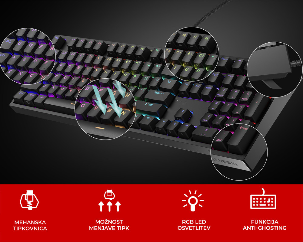GENESIS THOR 404 gaming mehanska tipkovnica, žična, RGB LED osvetlitev, Hot-Swap tehnologija, Anti-Ghosting, Outemu Peach Silent V3 stikala, spomin, programska oprema, Plug & Play, F1-F12, črna