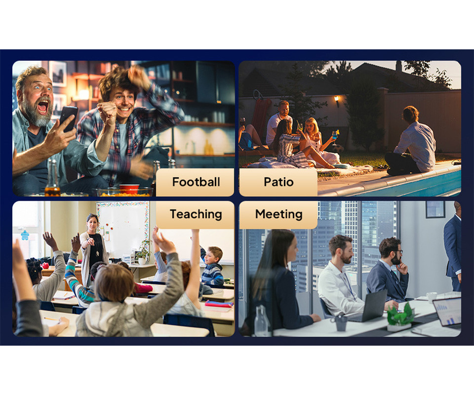 Prepustite se, da projektor poskrbi pri popestritvi vaših praznovanj, prikazu poslovnih predstavitev v sejni sobi, oglaševanju, promociji, tematskih večerih v dvoranah, ogledu filmov, brskanju po internetu, igranju igric, projekciji na avtodom ali počitniško prikolico - kjerkoli in kadarkoli!