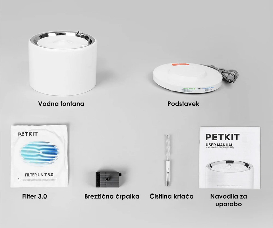 - Pametno upravljanje prek aplikacije PETKIT – spremljanje stanja naprave, opomniki za menjavo filtra in dolivanje vode.