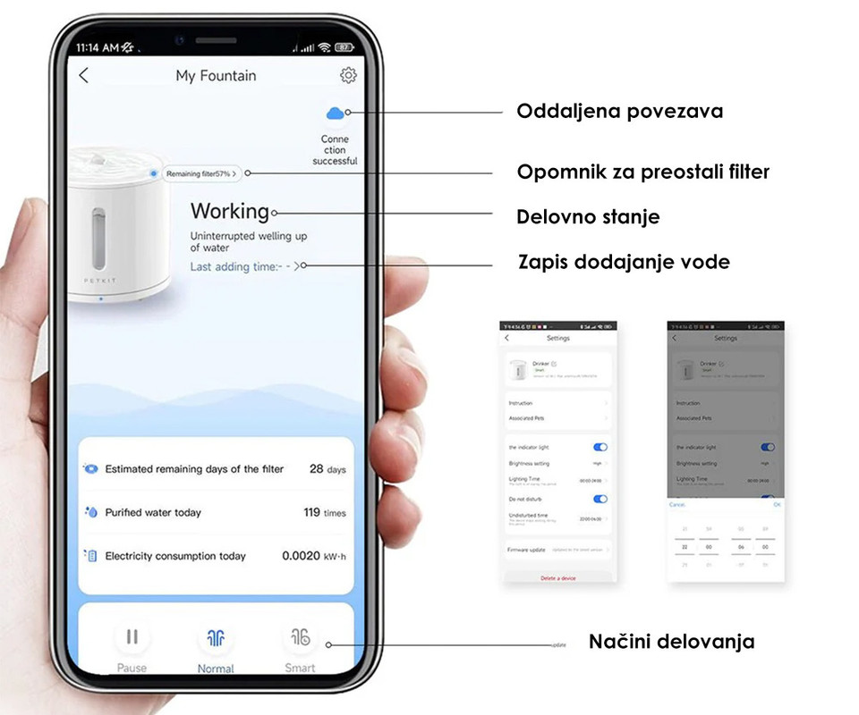 - Bluetooth povezava in aplikacija PETKIT – spremljanje nivoja vode, stanja filtra in nastavitev delovanja.