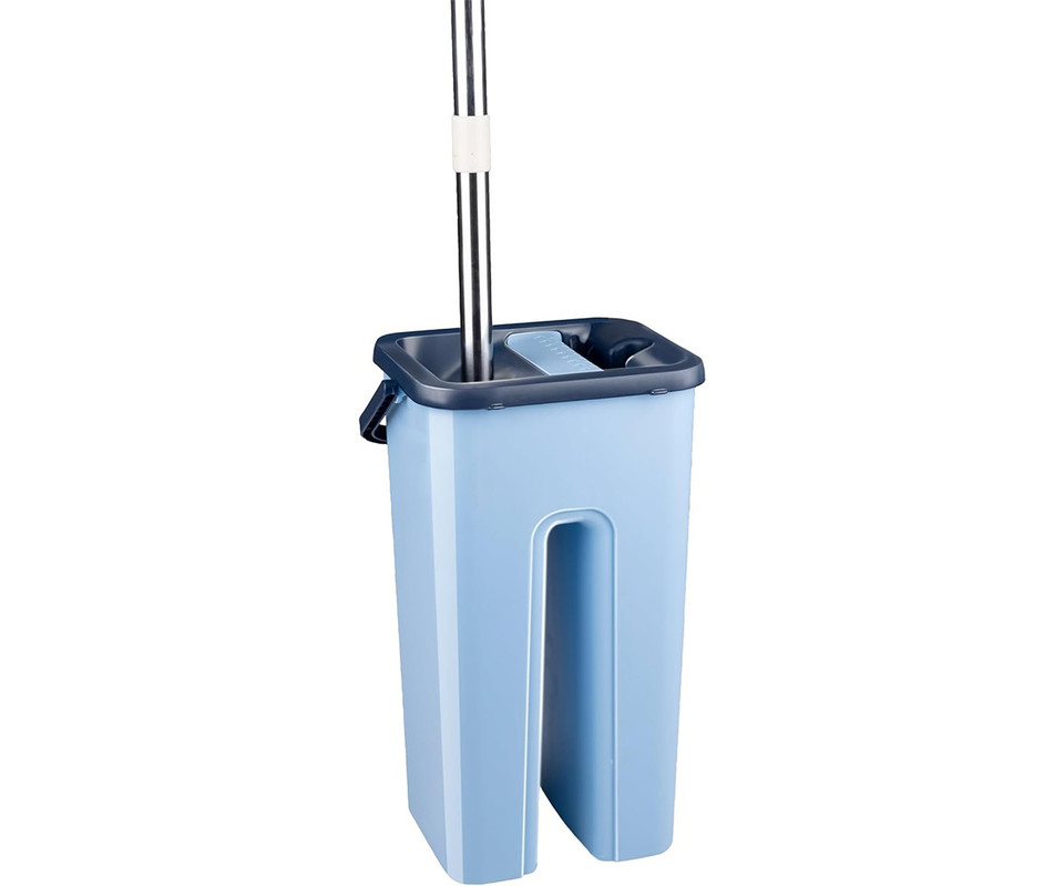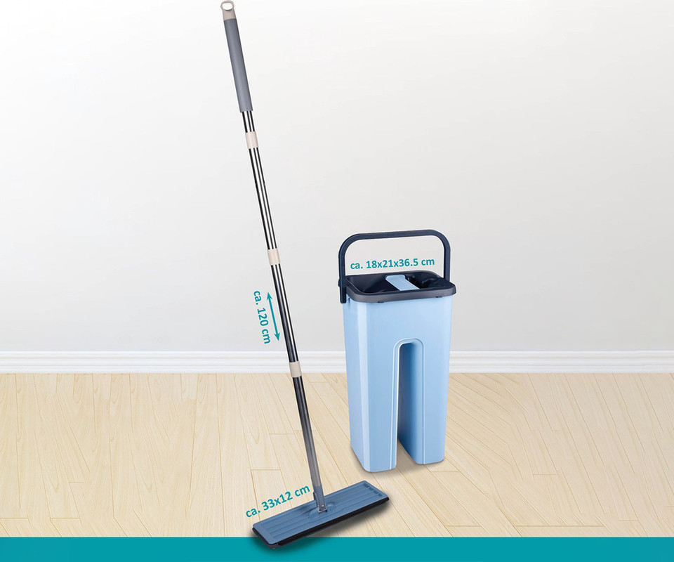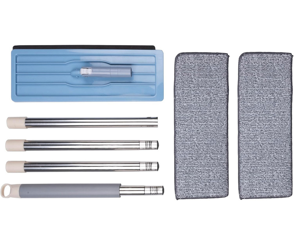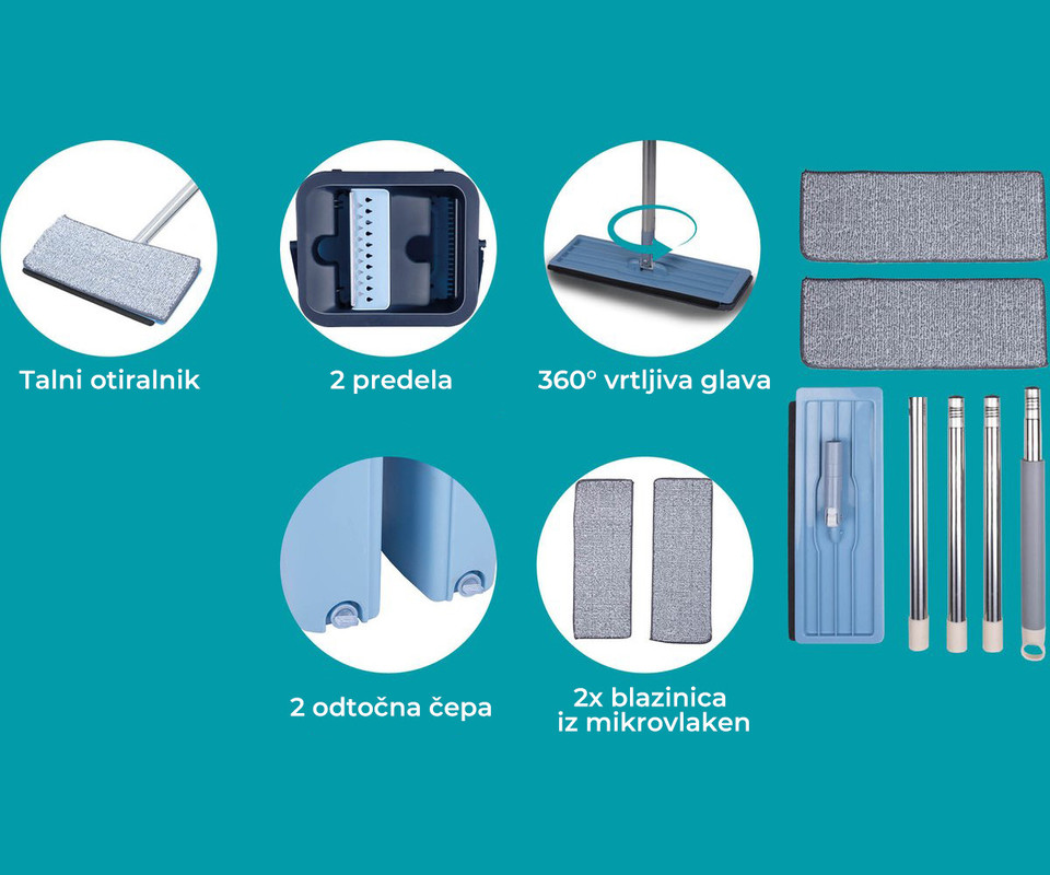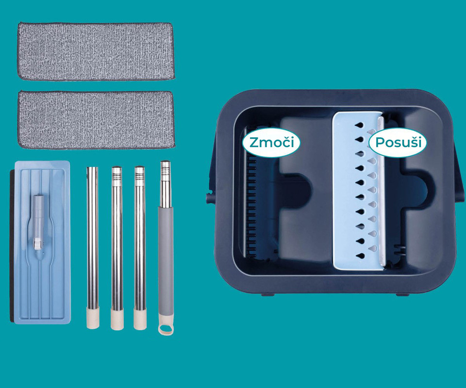 Set je sestavljen iz ročaja iz nerjavečega jekla, talnega otiralnika, vedra in dveh blazinic iz mikrovlaken. Vedro ima dva ločena rezervoarja: za čisto in umazano vodo. Tako lahko krpo preprosto navlažite s čisto vodo in nato ožamete v predelku za umazano vodo.