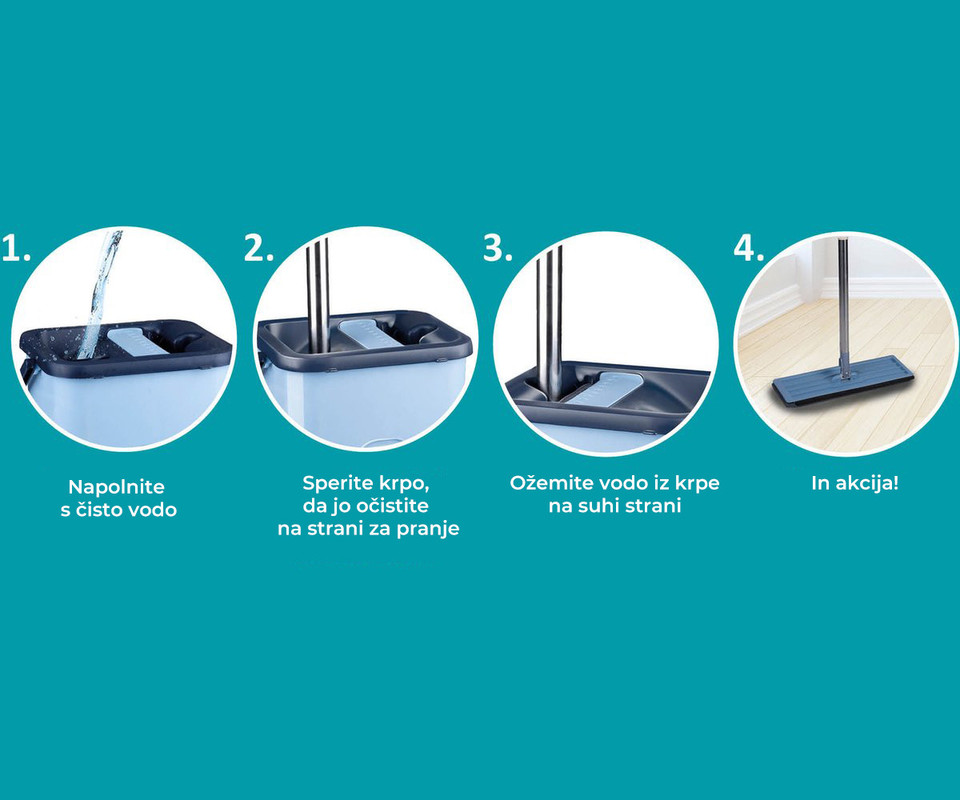 • Enostaven za uporabo - potopite krpo za tla na eni strani v čisto vodo in jo ožemite na drugi strani.