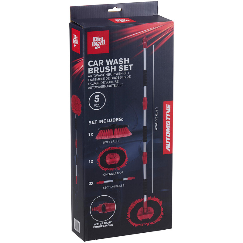 DIRT DEVIL komplet za pranje / čiščenje vozil, 5 kos, ALL IN ONE, 1x mehka krtača, 1x šenilna krpa, 3x držalo, možnost priključitve cevi za vodo, črn, rdeč
