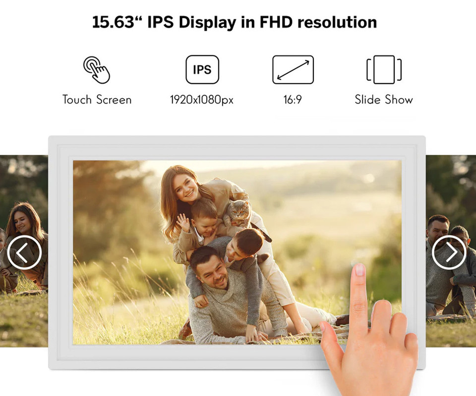 Okvir je opremljen z 15.6-palčnim IPS FHD zaslonom z ločljivostjo 1920 x 1080 px, ki zagotavlja ostro sliko, žive barve in široke kote gledanja. Zaslon na dotik omogoča enostavno upravljanje, pregledovanje galerije ter hitro prilagajanje nastavitev.