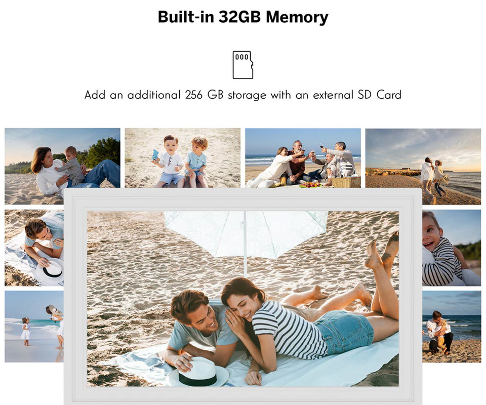 Okvir ima 32 GB notranjega pomnilnika, ki omogoča shranjevanje velike količine fotografij. Pomnilnik je mogoče razširiti s kartico microSD ali USB ključkom do 256 GB.