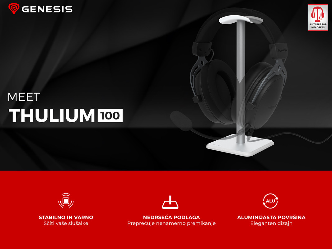 Predstavljamo vam stojalo, ki bo vašo opremo zaščitilo pred poškodbami. Poleg elegantne oblike ter kakovostnega materiala se stojalo za slušalke GENESIS THULIUM 100 zloži le v nekaj sekundah. Stojalo ima stabilno zasnovo, nedrseče podnožje in moderno aluminijasto površino.