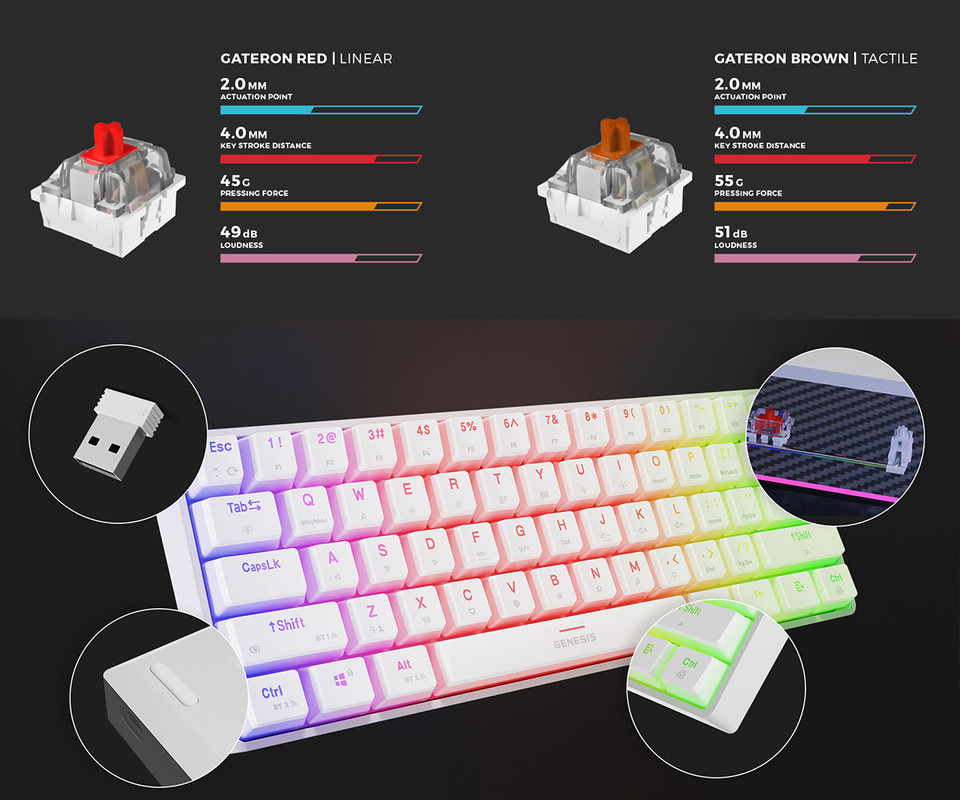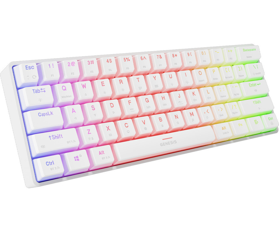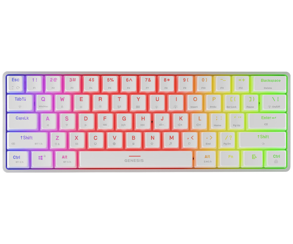 GENESIS THOR 660 G2 gaming mehanska tipkovnica, žična / brezžična, USB 2.4GHz / BT 5.0 / USB-C, baterija, RGB LED, RapidSpeed, Gateron Brown stikala, spomin, programska oprema, Plug & Play, bela