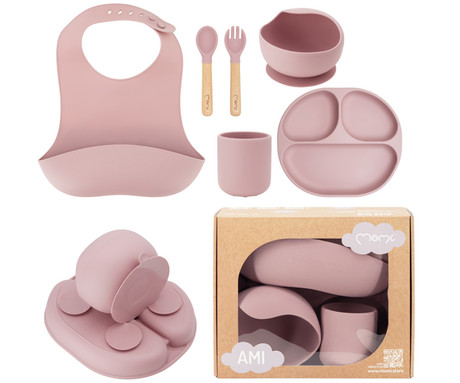 MoMi AMI otroški jedilni komplet, silikonski, roza