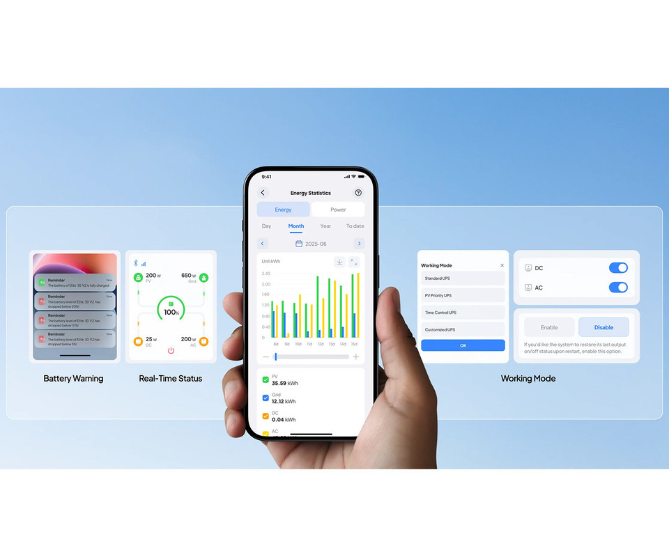 Upravljajte Premium 30 V2 s pametnega telefona. Z aplikacijo BLUETTI lahko nastavite načine polnjenja, urnike, opozorila in omejitve moči. Povežite se prek omrežja Wi-Fi ali Bluetooth in upravljajte svojo moč od koder koli – za pameten in sodoben življenjski slog.