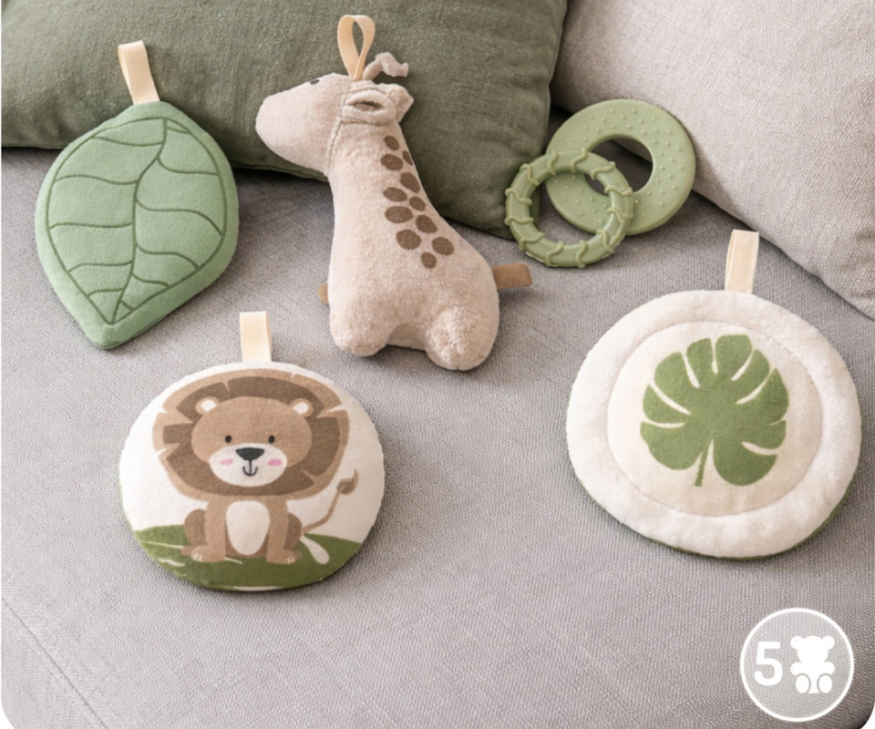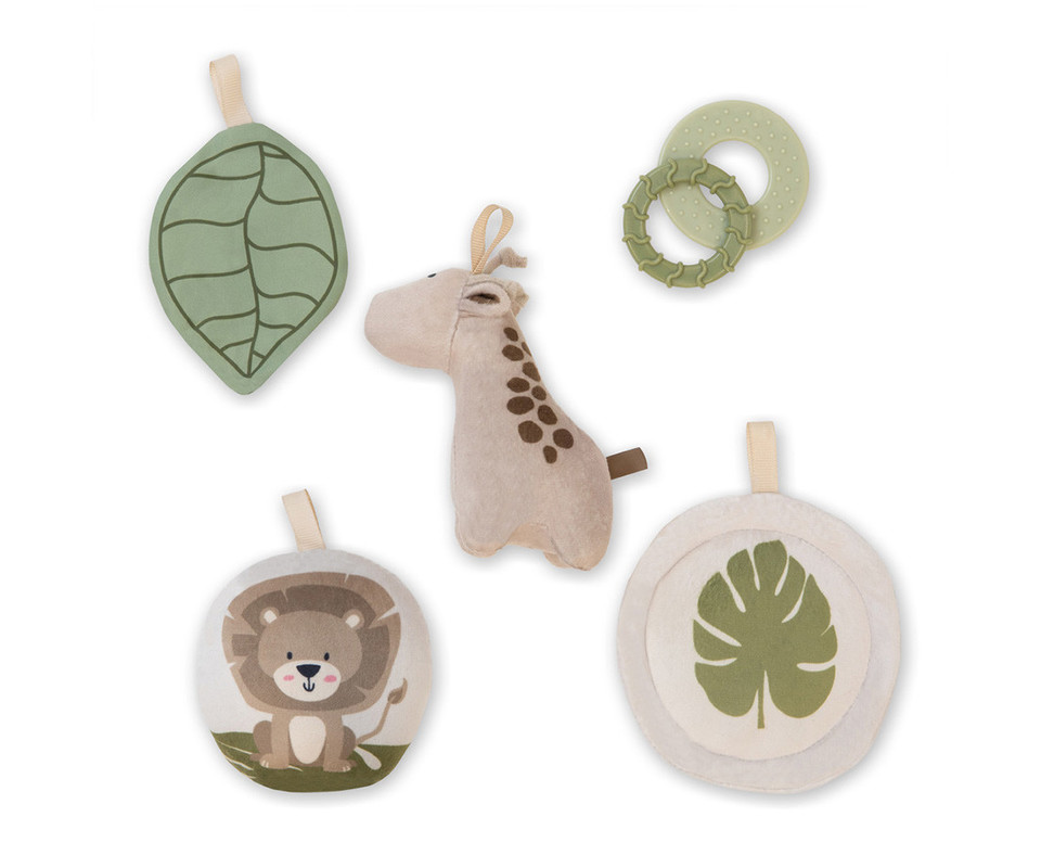 Podloga je opremljena s štirimi senzoričnimi igračami, ki jih je mogoče obesiti na loke ali uporabljati kot samostojne dodatke ter dvema grizaloma.