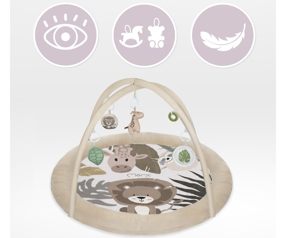 Debela, mehka in udobna podloga zagotavlja varen prostor za prve gibe, obračanje in plazenje. Na lokih z visečimi igračami se razvijajo dojenčkovi čuti – vid, dotik in koordinacija rok.