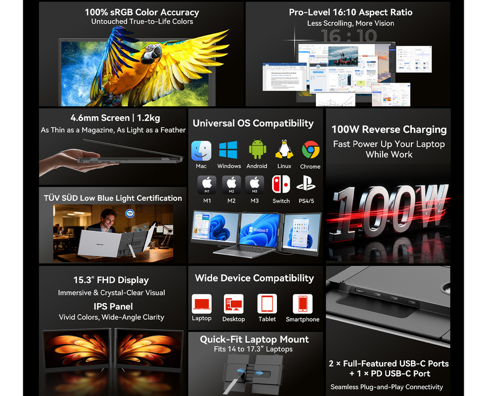 Spremenite kateri koli prostor v svojo mobilno delovno postajo z učinkovitostjo dveh zaslonov. Izjemno lahek in prijazen do oči, izboljša osredotočenost, zmanjša obremenitev oči in vam omogoča nemoteno opravljanje več nalog hkrati – ne glede na to, ali delate, se učite ali ustvarjate na poti.