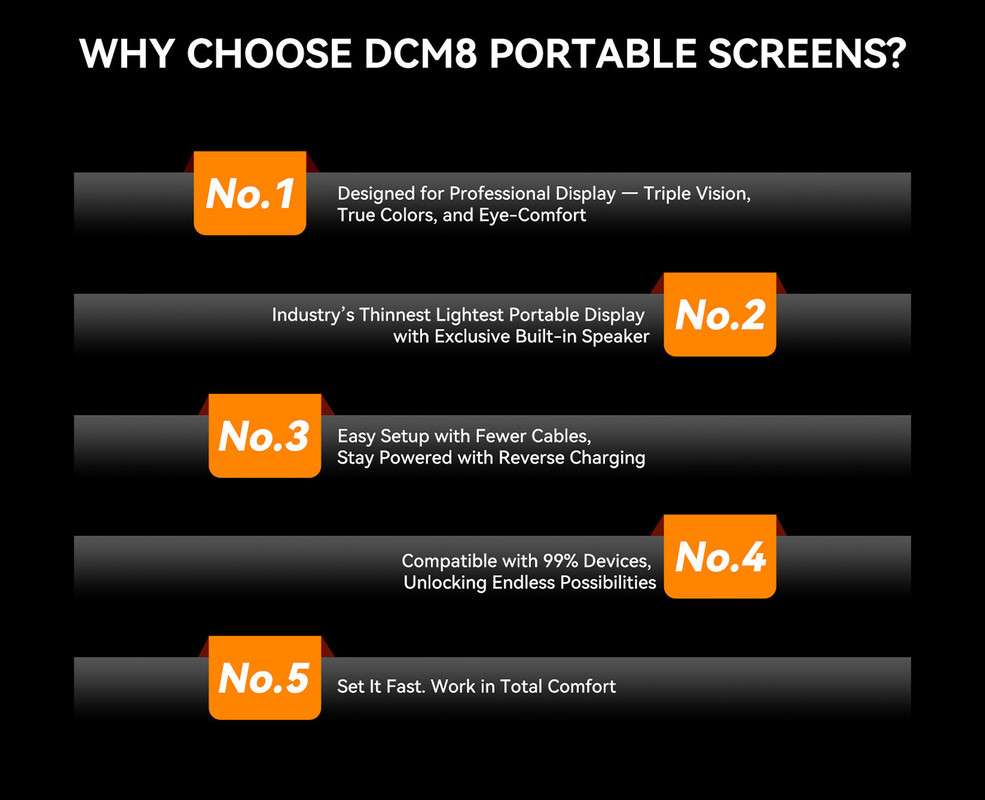 Doživite prihodnost prenosljivosti z DCM8. Z debelino le 4,6 mm in težo le 1,2 kg na novo opredeljuje lahkotnost in udobje. Brez težav ga pospravite v torbo, nesite ga kamor koli in uživajte v brezhibni izkušnji velikega zaslona brez kompromisov.
