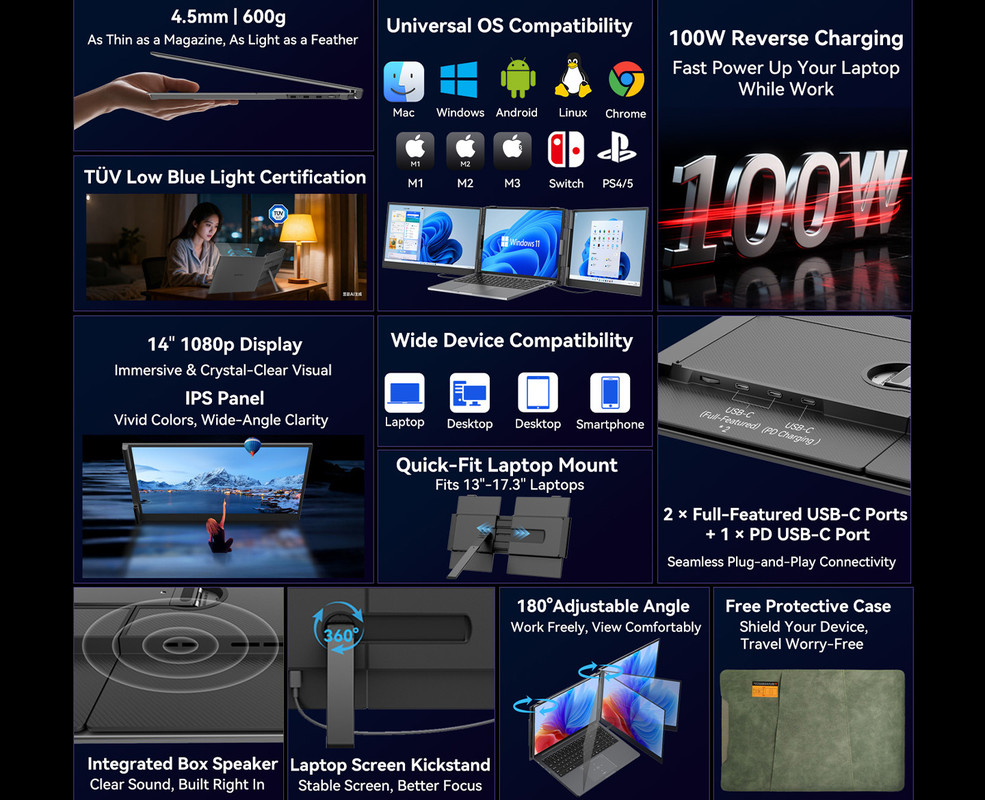 Spremenite kateri koli prostor v svojo mobilno delovno postajo z učinkovitostjo dveh zaslonov. Izjemno lahek in prijazen do oči, izboljša osredotočenost, zmanjša obremenitev oči in vam omogoča nemoteno opravljanje več nalog hkrati – ne glede na to, ali delate, se učite ali ustvarjate na poti.