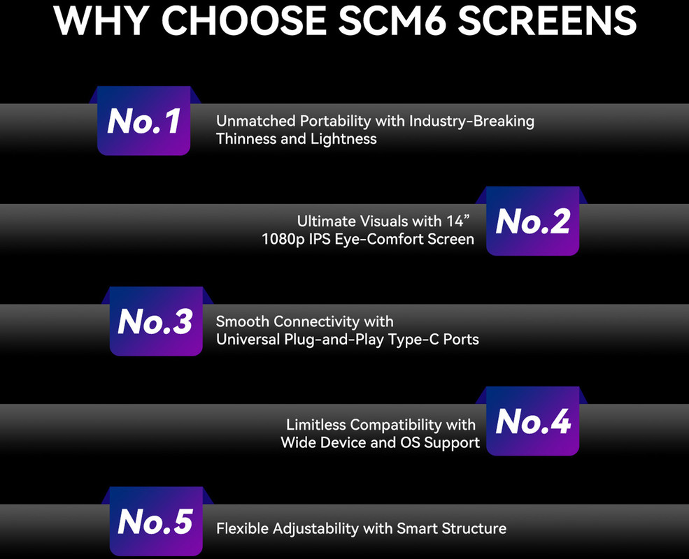 Z dvema polno opremljenima vhodoma USB-C in vhodom USB-C za polnjenje PD se SCM6 brezhibno prilagodi vsakemu prenosniku – ne glede na to, ali gre za nov prenosnik, ki ga priključujete le z enim kablom USB-C na USB-C, ali za starejši prenosnik, ki uporablja kabel USB-A na USB-C in kabel HDMI na USB-C za takojšnjo združljivost.