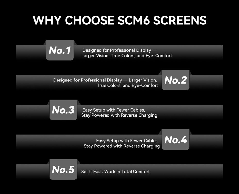 Doživite prihodnost prenosljivosti z SCM8. Z debelino le 4,6 mm in težo le 800 g na novo opredeljuje lahkotnost in udobje. Brez težav ga pospravite v torbo, nesite ga kamor koli in uživajte v brezhibni izkušnji velikega zaslona brez kompromisov.