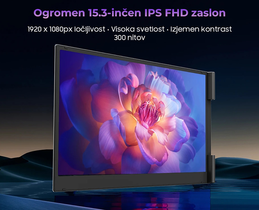 Doživite poglobljeno sliko na poti s tem 15.3"(38,86 cm) palčnim prenosnim zaslonom. Z ločljivostjo Full HD 1920 × 1200 px in svetlostjo 300 nitov je vsaka sličica ostra, gladka in živo barvita tako za delo kot za igro.