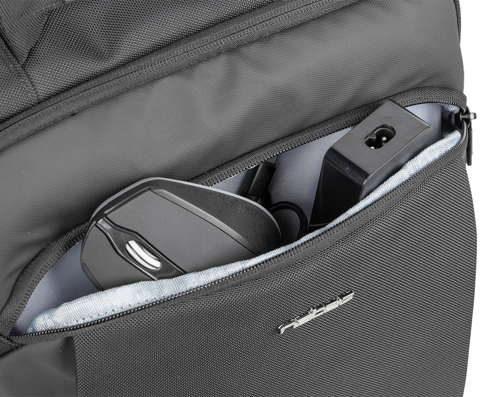 - Priložen organizator – opremljen z dodatnim organizatorjem, v katerega lahko spravite kable, polnilnike in osebne predmete.