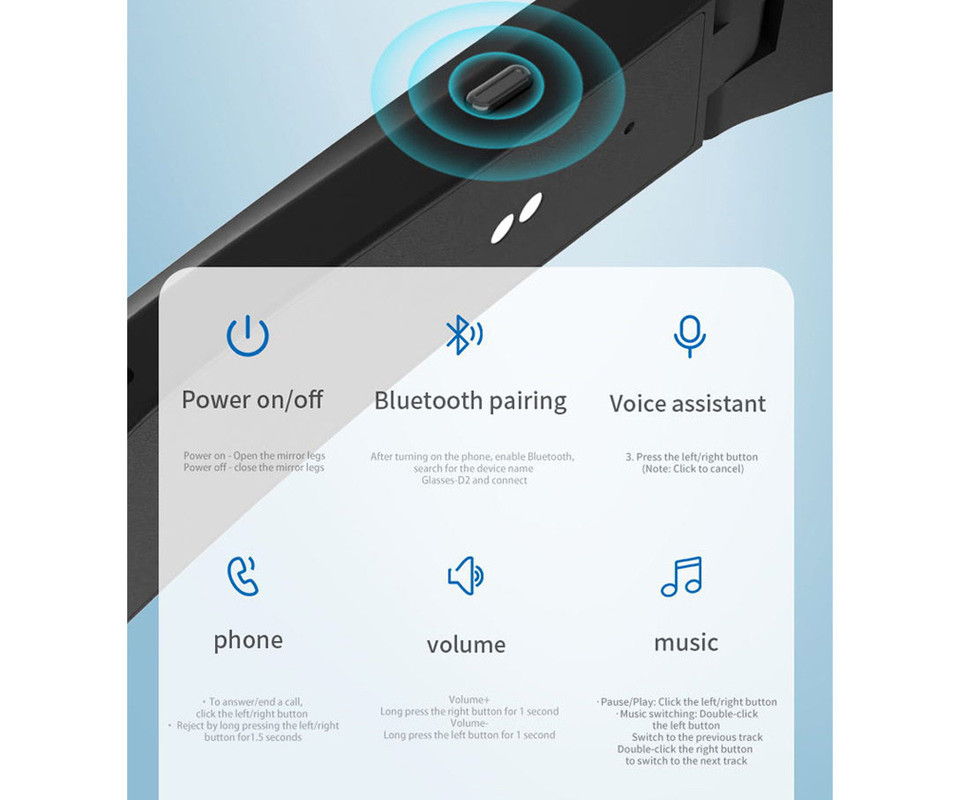 - Wearable sensor switch – samodejno vklapljanje/izklapljanje ob nošenju/odstranitvi očal.
