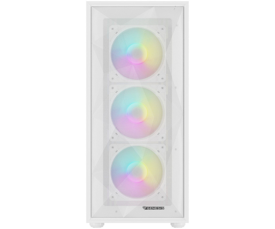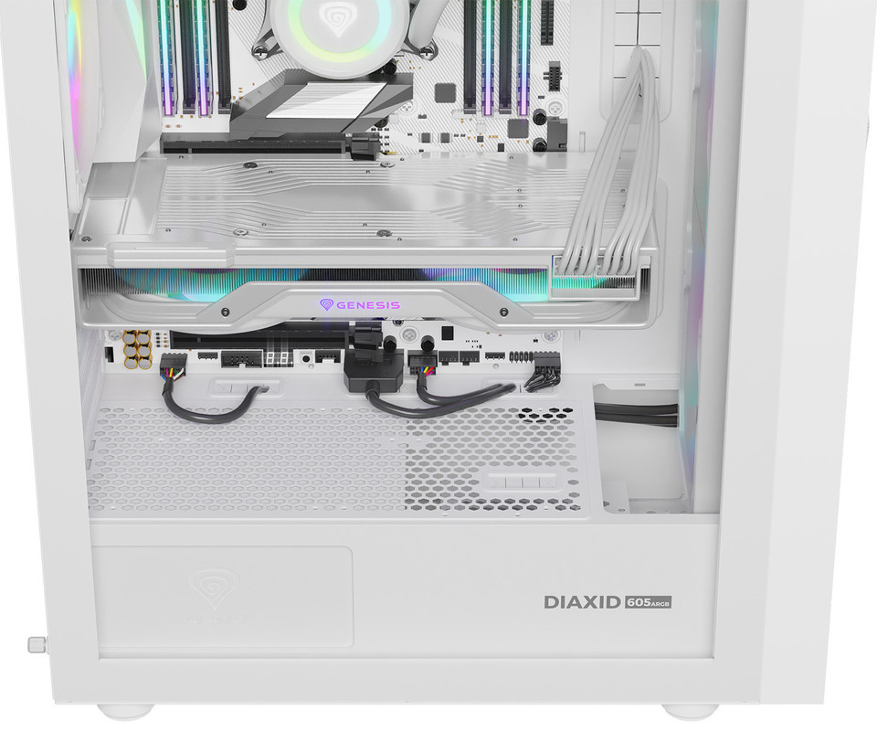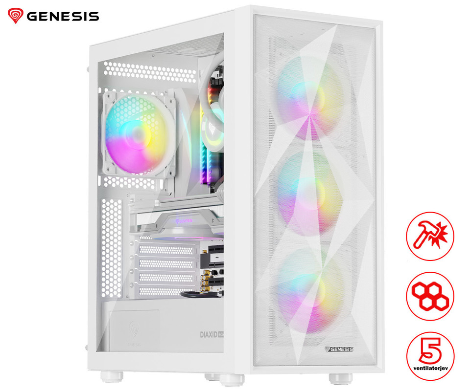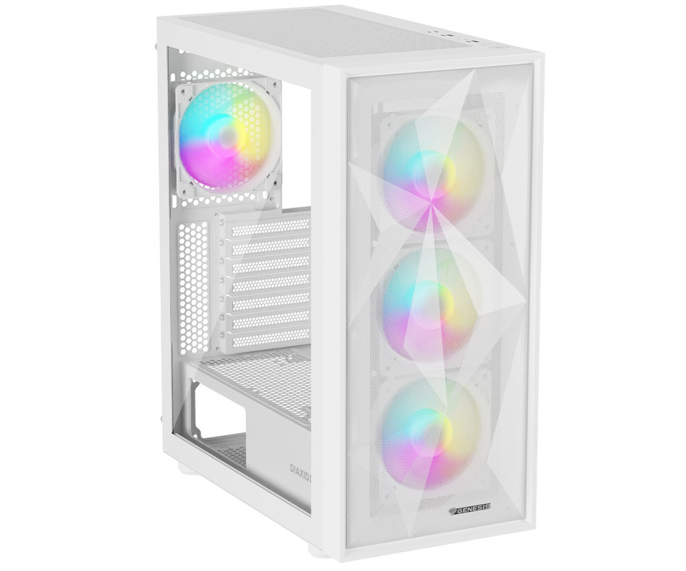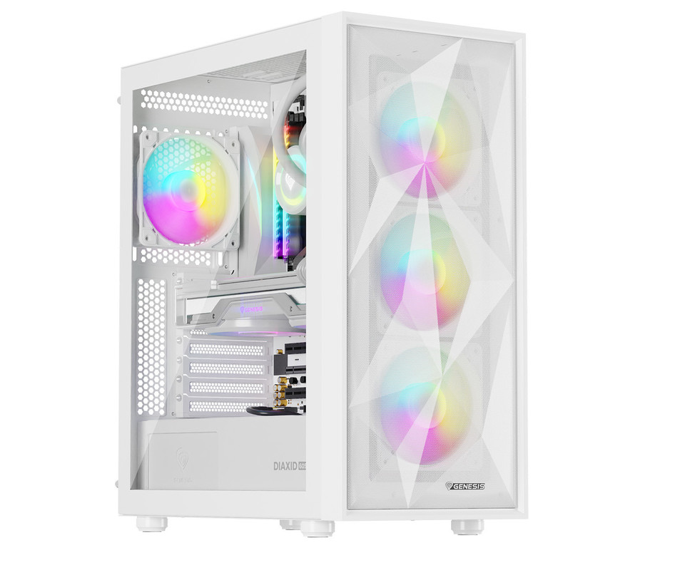 GENESIS DIAXID 605 ARGB računalniško ohišje, Midi Tower, 4x ventilator, AIO LC do 420mm, GPU do 351mm, CPU Cooler do 168mm, MESH plošča, kaljeno steklo, ARGB LED osvetlitev, 420x217x466mm, belo