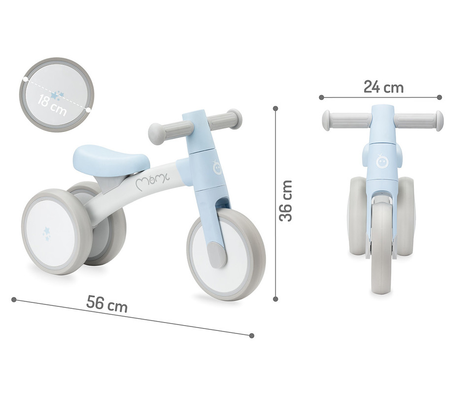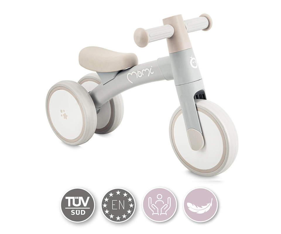 MoMi TEDI ima udobno, široko krmilo s protizdrsnimi ročaji, ki zagotavljajo dober oprijem in ravnotežje. Ima trpežen in na poškodbe ter zlom odporen okvir. Je zelo stabilen in varen. Priporočljiv je za otroke od 1 leta starosti dalje.