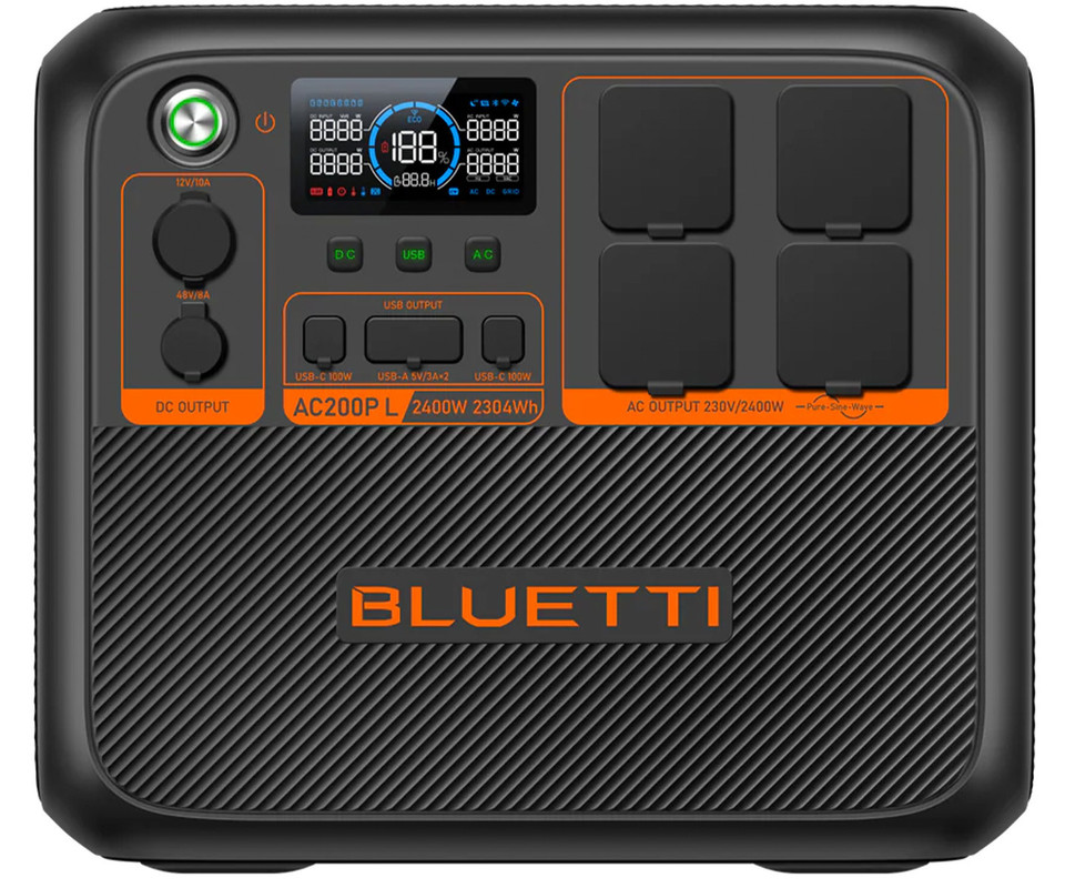 BLUETTI AC200PL prenosna polnilna postaja, 2400W moč, 2304Wh baterija, polnjenje / napajanje naprav, BMS sistem, aplikacija, 4x AC, 2x DC 48/12V, 2x USB-A, 2x USB-C, zaslon, ročaj, črna