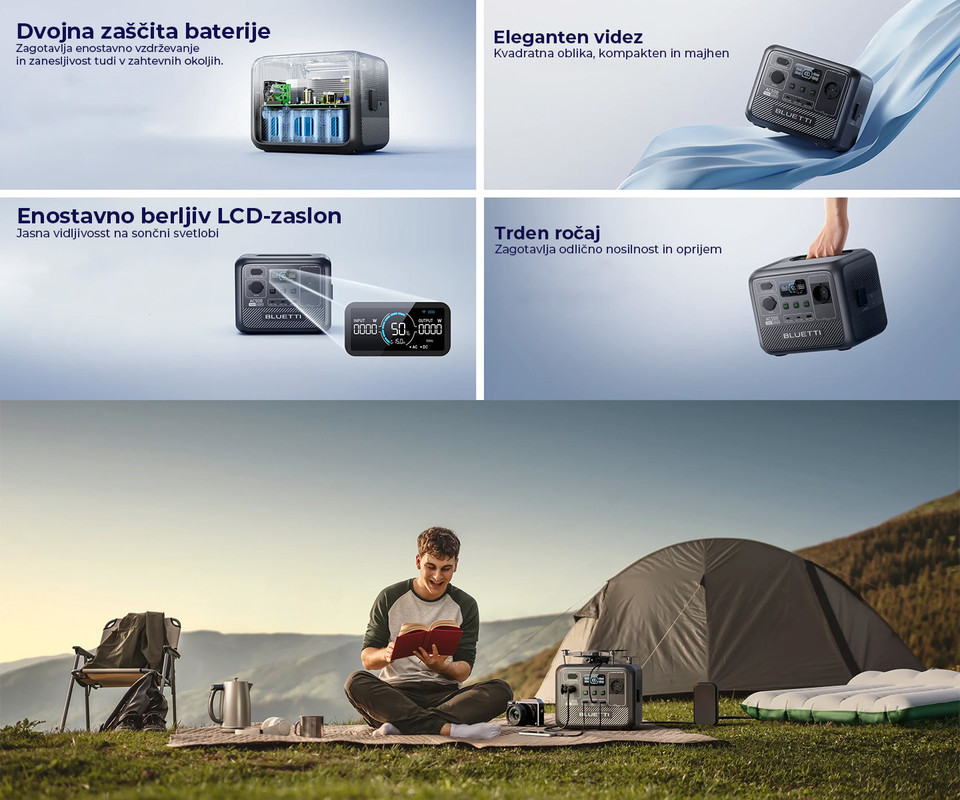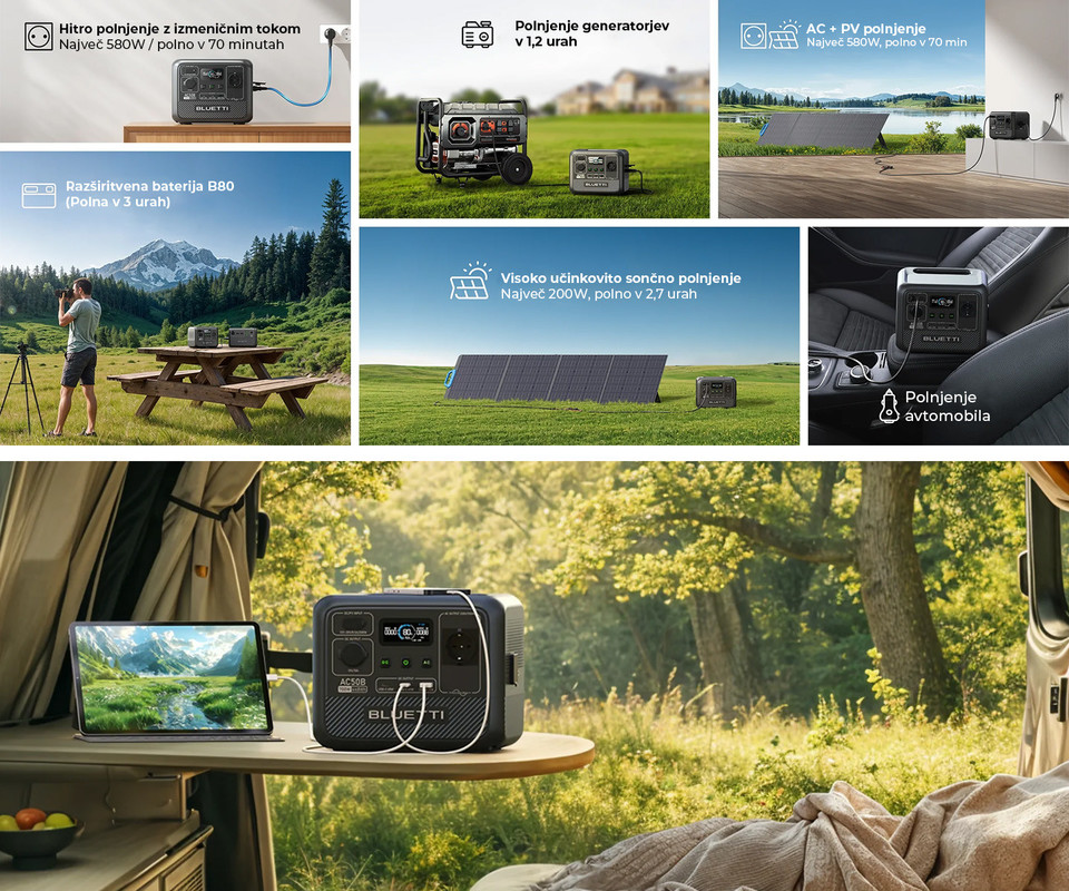 Polnilna postaja BLUETTI AC50B je nekaj, s čimer se lahko pohvalite v svoji kamperski skupini. Ima kapaciteto 448 Wh in visoko izhodno moč 700 W, kar vam zagotavlja dovolj energije za osnovne potrebščine. Napredni inteligentni sistem AI-BMS optimizira porabo energije, s čimer poveča čas delovanja in učinkovitost.