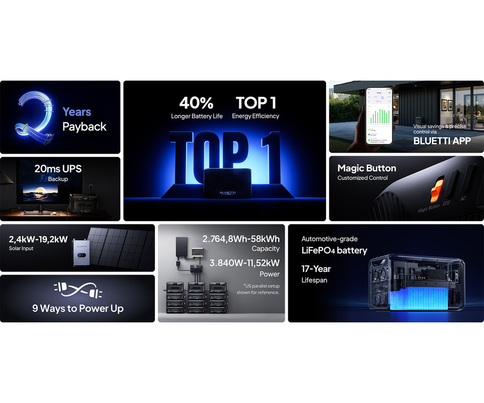 • Neprimerljiva moč 3840W - z vgrajeno LiFePO4 polnilno baterijo s kapaciteto 2764Wh ima izjemno zmogljivost, ki zagotavlja več kot 17 let uporabe in omogoča največ ciklov polnjenja od vseh BLUETTI izdelkov.