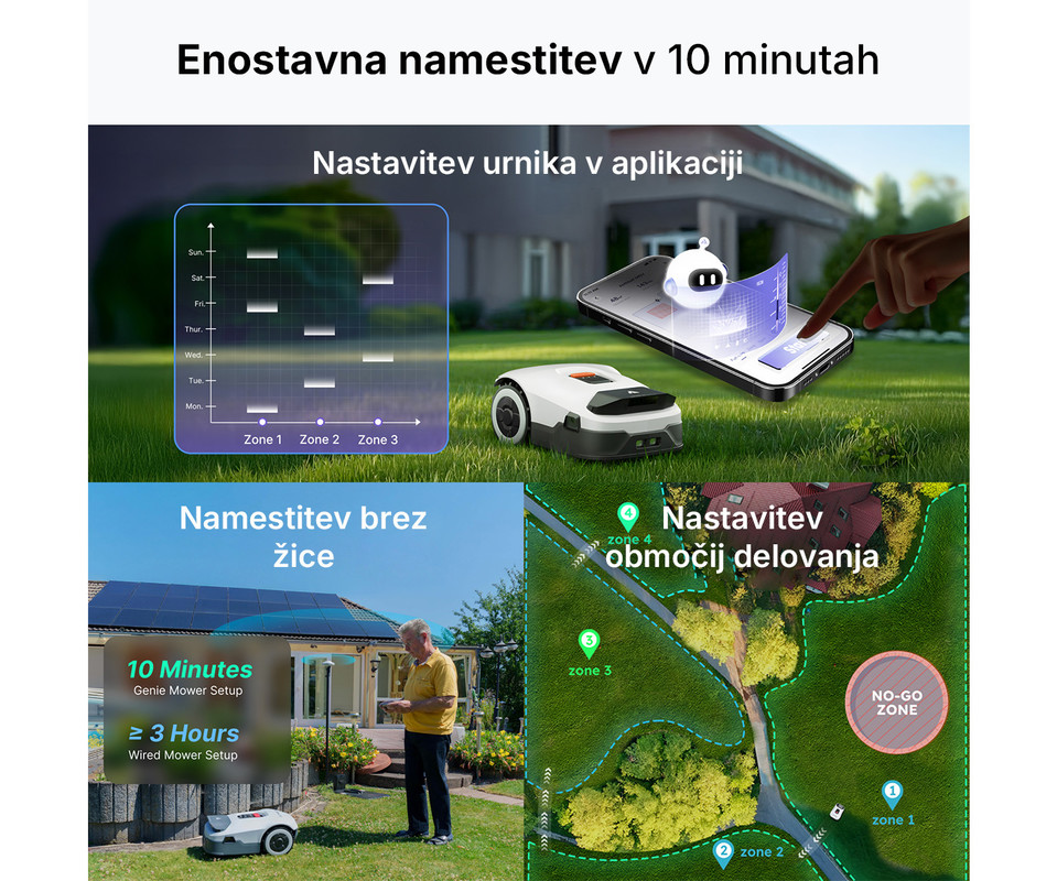 Brezžična namestitev • Brezskrbna samodejna košnja • Intuitivno upravljanje več območij preko mobilne aplikacije.