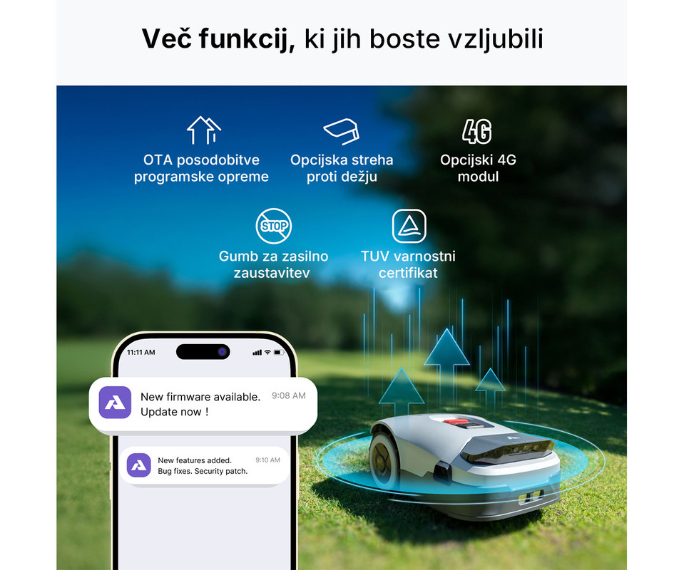 • Lastnosti in funkcije: košenje trat do velikosti 900m2, AI Vision 300° vidni kot, tehnologija Plug & Play, enostavna in hitra namestitev v 10 minutah, samodejno ali hibridno daljinsko mapiranje, upravljanje več območij, brezhibno načrtovanje poti, nastavljanje urnika delovanja, samodejna vrnitev na polnjenje ob nizki stopnji baterije, zaznavanje in izogibanje 1000+ različnim oviram, smer košnje od 0° do 180°, košenje vseh terenov do naklona 45%/24°, rezila s prevleko iz titana, nastavljiva višina košnje trave od 3 do 7 cm, 4G LTE povezovanje, digitalna ograja proti kraji z alarmom in obvestili, 50% boljša stabilnost v senčnih območjih, IPX6 vodoodpornost, samodejna vrnitev na postajo v primeru dežja, ultra tiho delovanje,…