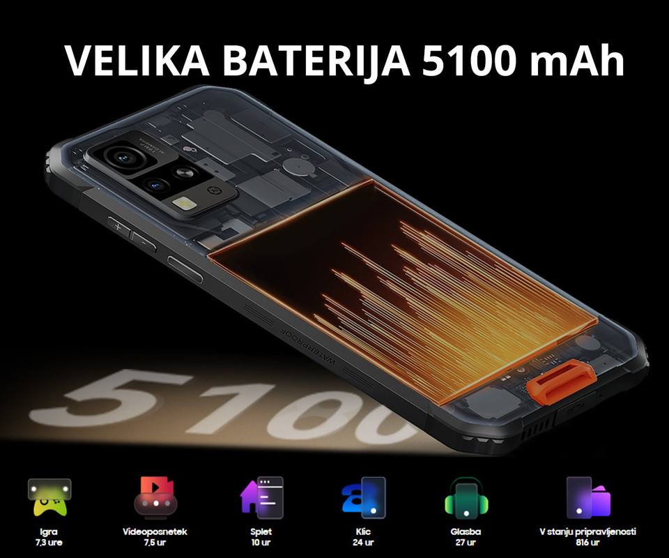 - 5100 mAh baterija – zelo velika kapaciteta omogoča več dni uporabe brez polnjenja