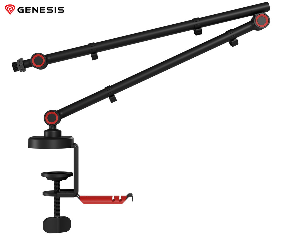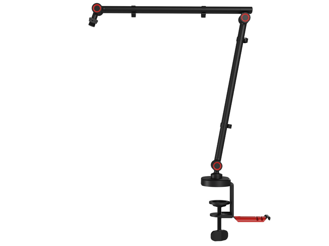 Držalo, pritrjeno na podnožje ročice z dvema vijakoma, ki zagotavljata popolno stabilnost, nudi namensko mesto za vaše slušalke, ki jim ni več treba zavzemati prostora na mizi ali policah. Nosilec ima dodatno 2 utora za kable, ki omogočata hkratno napeljavo kablov mikrofona in slušalk. Nastavljiva črna roka mikrofona z rdečimi poudarki in držalom za slušalke, zasnovana za optimalno pozicioniranje in udobje.